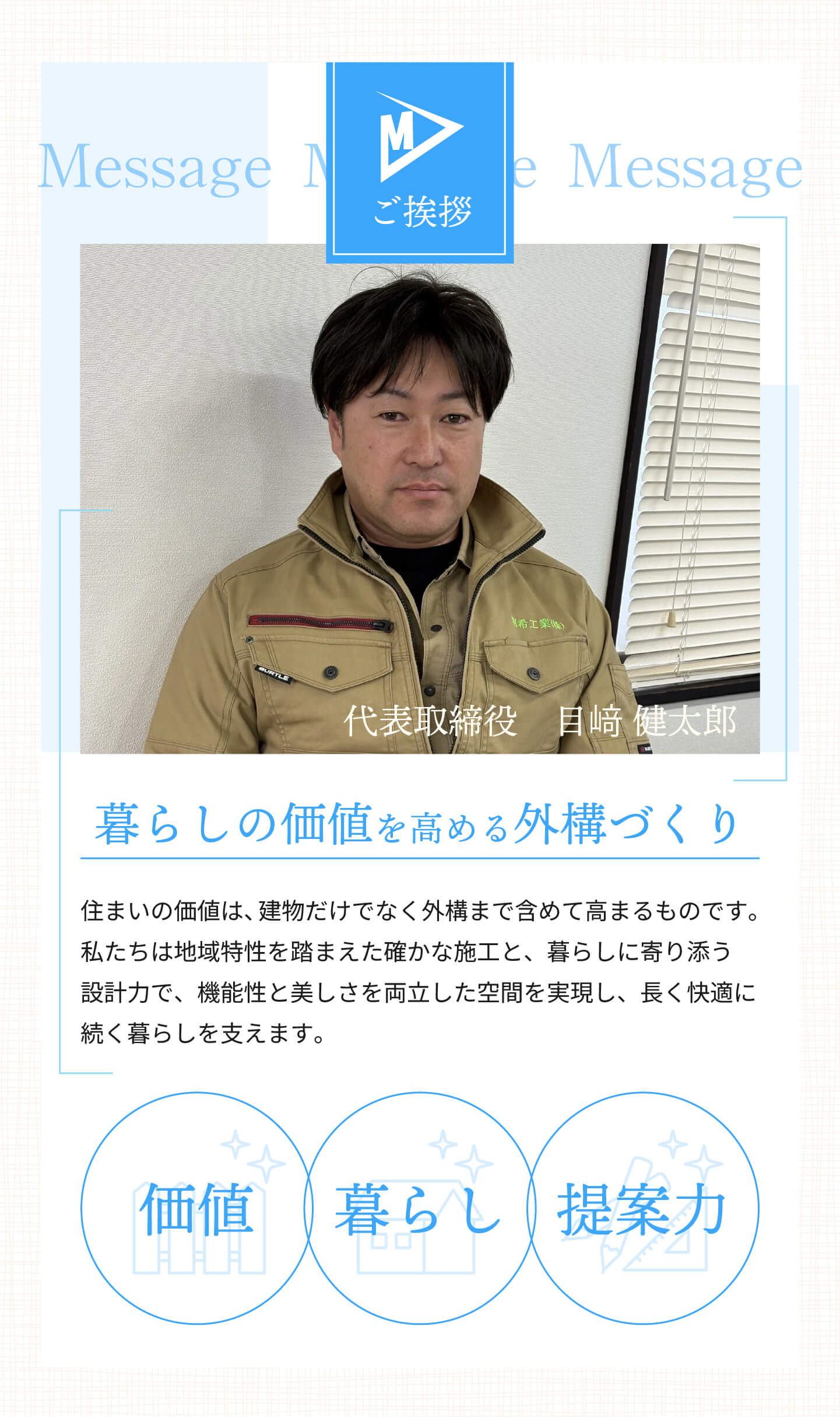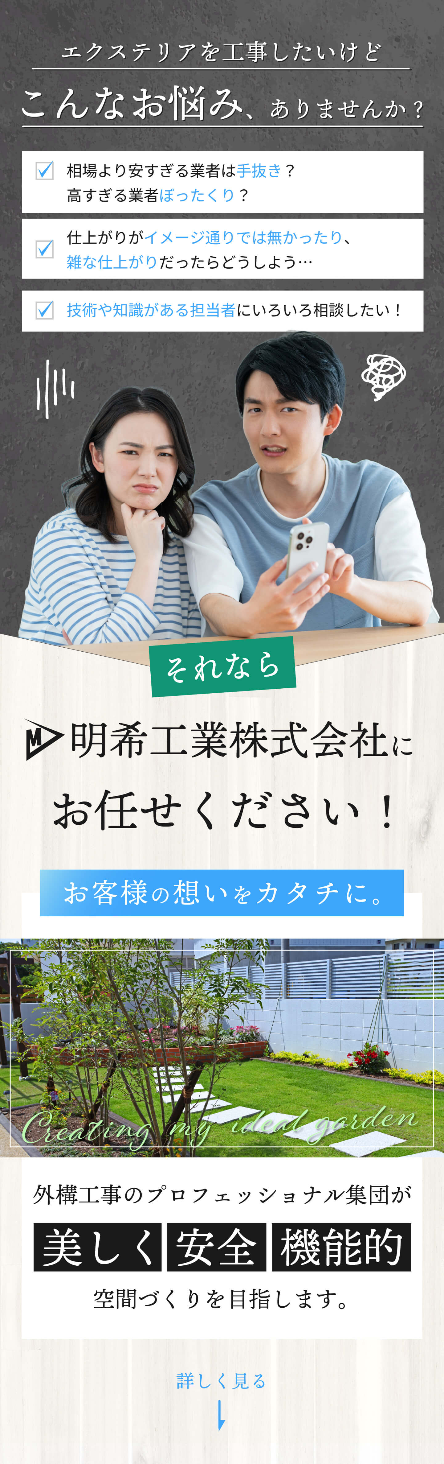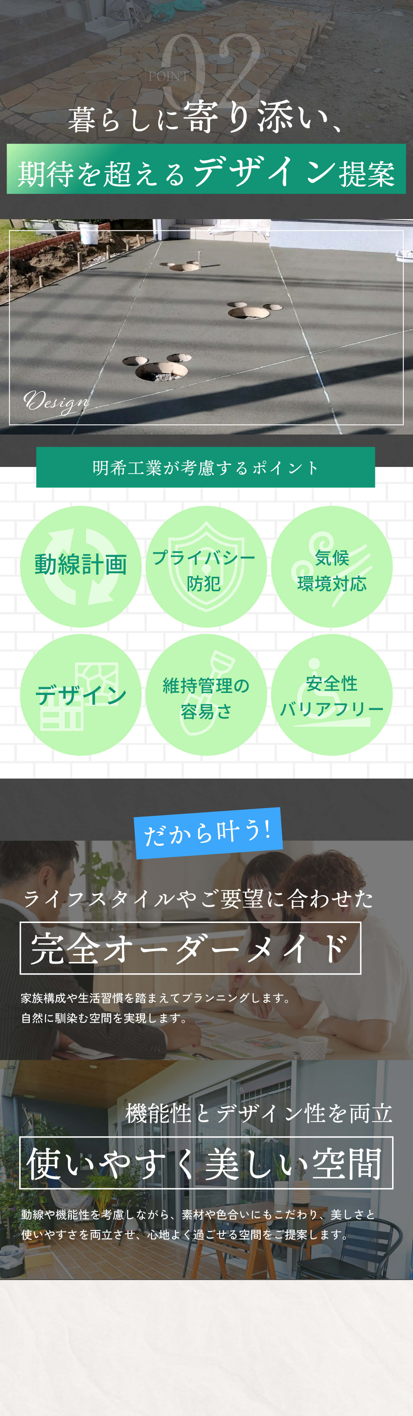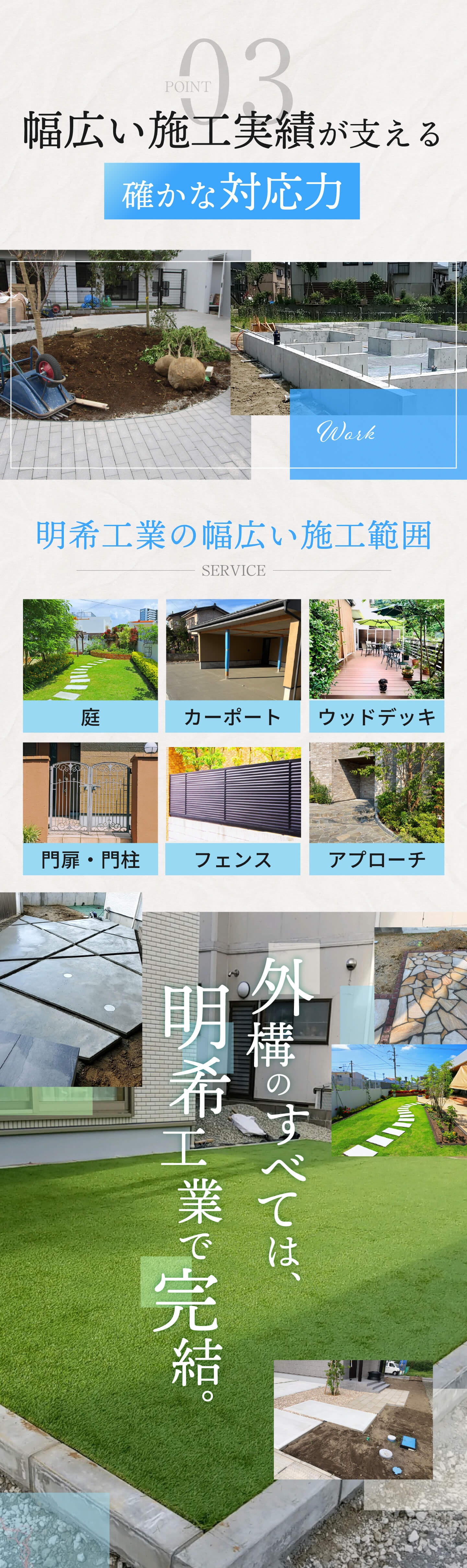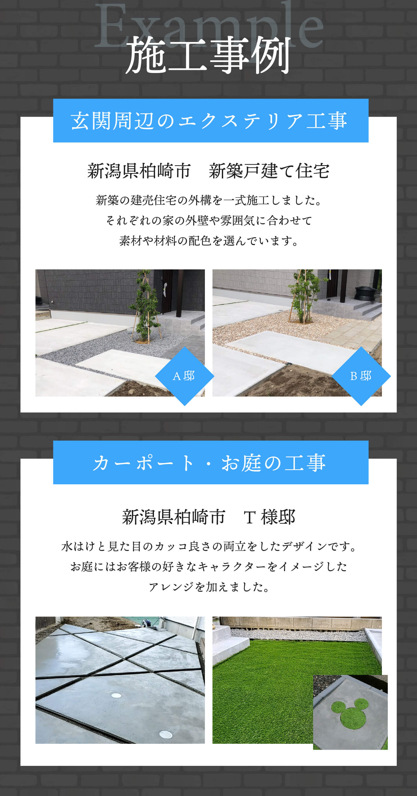 | 事業内容 | エクステリア工事,外構工事,一般土木工設計・施工,左官工事一式,基礎工事,除雪作業工事 |